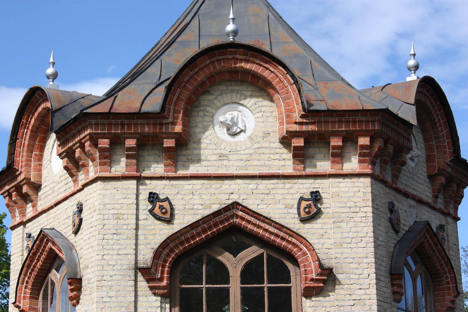Källorna tiger om lusthusets tillkomsthistoria, men ingen kan tvivla på att det är ritat av en skicklig arkitekt. Misstankarna faller på Johan Fredrik Åbom, som var Stockholms ledande arkitekt när han fick förtroendet att leverera ritningarna till Axmars nya herrgård 1861. Även om Åbom föredrog nyrenässansen visar byggnader som Frimurarhuset i Gävle att han behärskade en bredare stilhistorisk repertoar. Lusthuset i Axmar är byggt i en blandstil med gotiska inslag. Fasaderna i gult, fogstruket tegel är prydda med krigsguden Mars tecken: symbolen för den järnhantering som skapade Axmars och familjen von Schinkels välstånd. Men hur ska man tolka den vädrande jakthunden i gavelfältens medaljonger? Är det helt enkelt ett porträtt av någon av bruksägaren Bernt von Schinkels egna favorithundar? Den realistiska framställningen kan tyda på det.